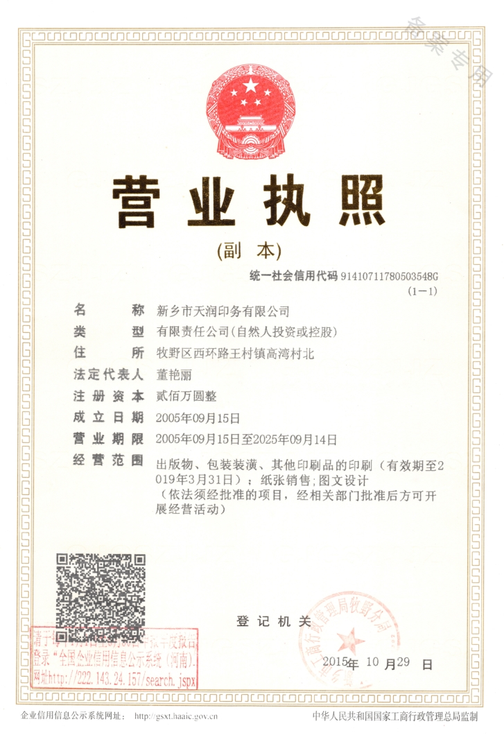 新乡市天润印务有限公司,坐落于新乡市牧野区西环路东侧梦溪路2号,紧邻北环路,为企业的发展提供了便利的交通条件。创建于2005年1月,注册资金200万元,是全国书报刊定点**企业。主要从事**物、包装装潢、其他**品等**业务。建厂以来公司员工大力弘扬“团结、敬业、务实、创新”的企业精神,开拓进取,艰苦创业,使企业不断发展壮大,充满生机和活力。全厂现有员工80多名,其中****技术人员15余名,技术骨干人员10余名;占地面积10000余平方米;建筑面5500平方米;其中办公面积300平方米,住宿和员工活动室500平方米,生产车间面积4700平方米; 公司成立以来在各级领导的关心和支持下,不断发展和壮大,拥有大对开2+2海德堡彩印机、四开海德堡彩印机,北人204D双色轮转**机、北人JJ4...
